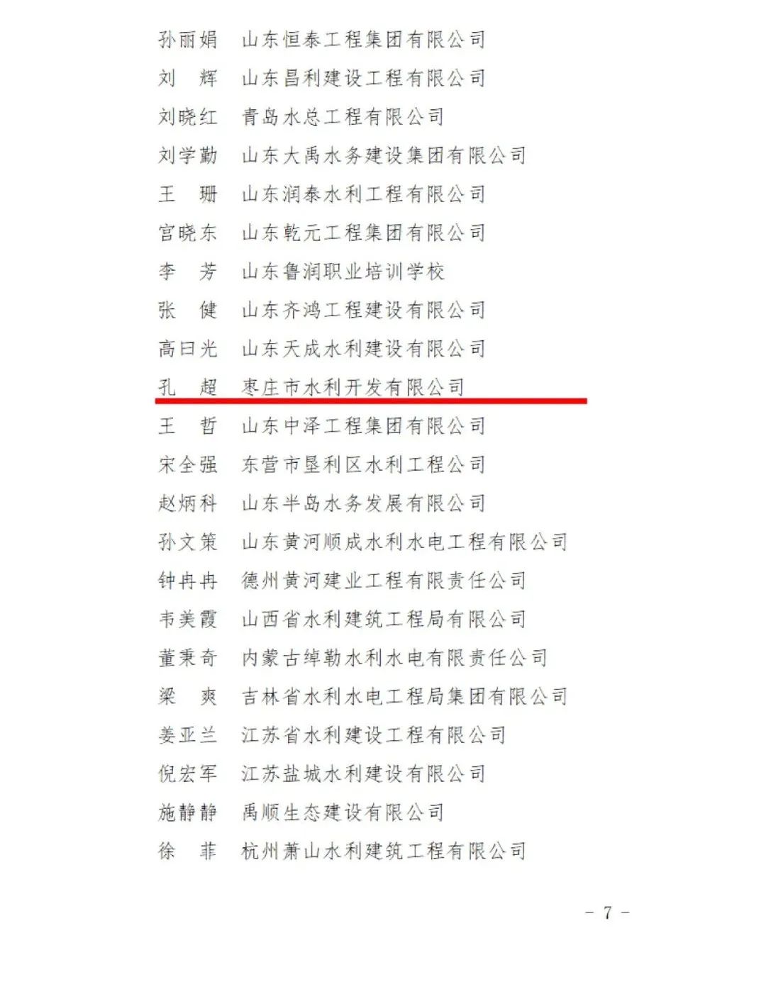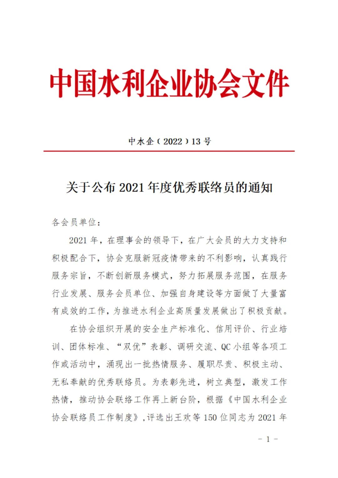 近日,中國(guó)水利企業(yè)協(xié)會(huì)公布了2021年度全國(guó)優(yōu)秀聯(lián)絡(luò)員名單,棗莊市水利開(kāi)發(fā)有限公司的孔超同志榮獲全國(guó)優(yōu)秀聯(lián)絡(luò)員稱(chēng)號(hào)。